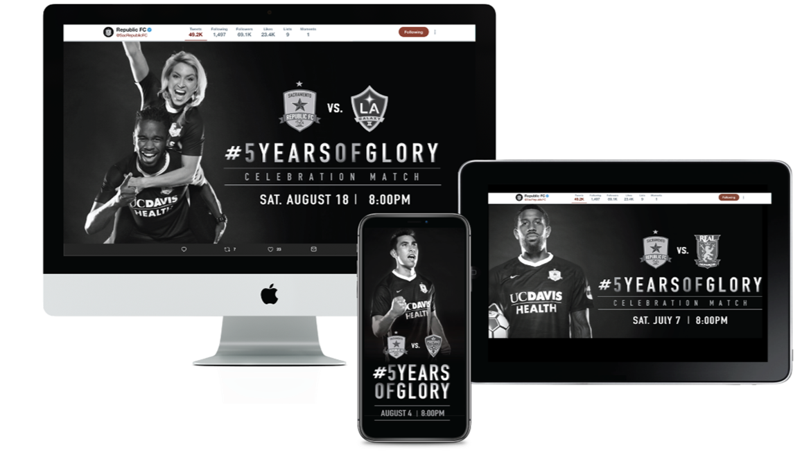 The jersey unveil kicked off a “#5YearsOfGlory” celebration that spanned five themed matches throughout the season and included special activations, appearances from former Republic FC legends, historical photo displays, and new commemorative merchandise, among other festivities. We promoted these matches with ads that ran as paid and organic social, email banners, web banners, and Google ads.